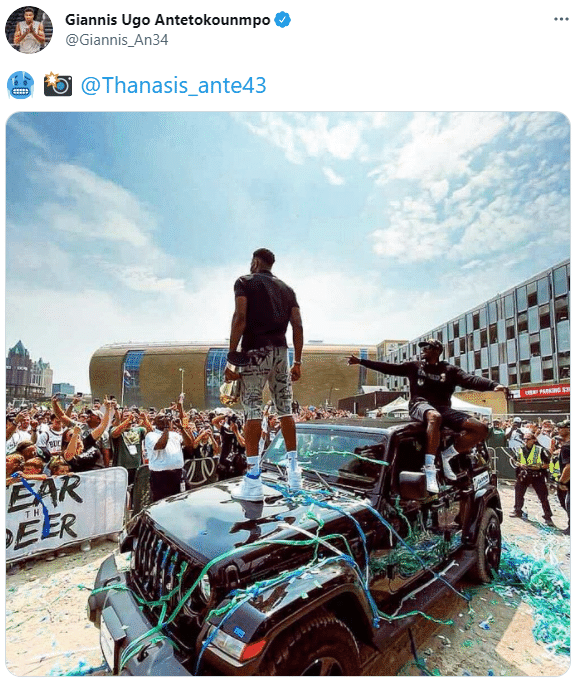 夺冠庆典结束之后,字母哥晒出一张霸气照——手里拿着FMVP奖杯,站在车头上和球迷一起狂欢,现场撒满彩带。