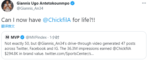 密尔沃基这家炸鸡店躺赚近30万美元,对此字母哥发推并且写道:现在我可以免费吃一辈子了吗?