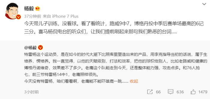 而比赛的结果,还真让杨毅给猜中了!并且他点名的路威和博格丹,的确打出了出色表现,路威9中7得到21分,博格丹投进6记三分。连杨毅自己,都不免有些飘飘然。