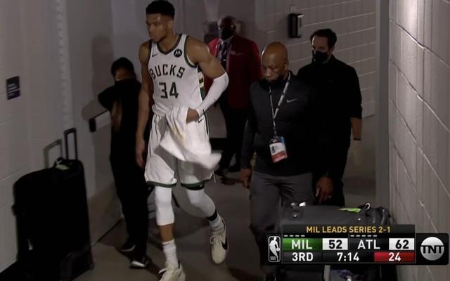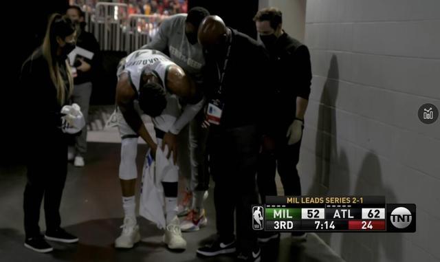 弄伤欧文的报应?字母哥左膝扭成60度,表情痛苦返回更衣室