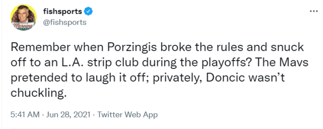 季后赛期间,波尔津吉斯曾因前往夜店被联盟罚款,有记者爆料,虽然独行侠对此事装作一笑而过,东契奇却笑不出来。