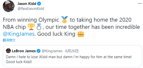 此前詹姆斯发推表达不舍之情:该死的,我讨厌失去基德,但我也为他开心,祝基德好运!如今基德正式回应詹姆斯:从赢得奥运金牌到夺得2020年NBA总冠军戒指,我们在一起的时光太不可思议,祝你好运,国王!