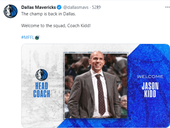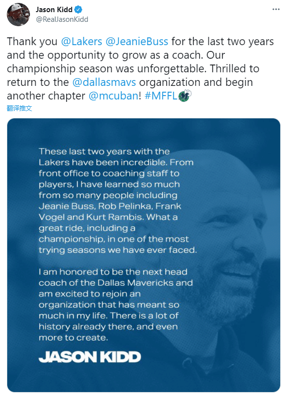 基德发推写道:谢谢湖人和珍妮-巴斯在过去两年里让我有机会成为一名教练,我们的冠军赛季令人难忘;独行侠对我意义重大,很荣幸能够成为独行侠新教练,这是多么伟大的旅程。
