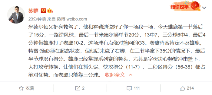 雄鹿进总决稳了?杨毅调侃特雷杨被裁判垫脚,苏群:老鹰只能靠三分球!