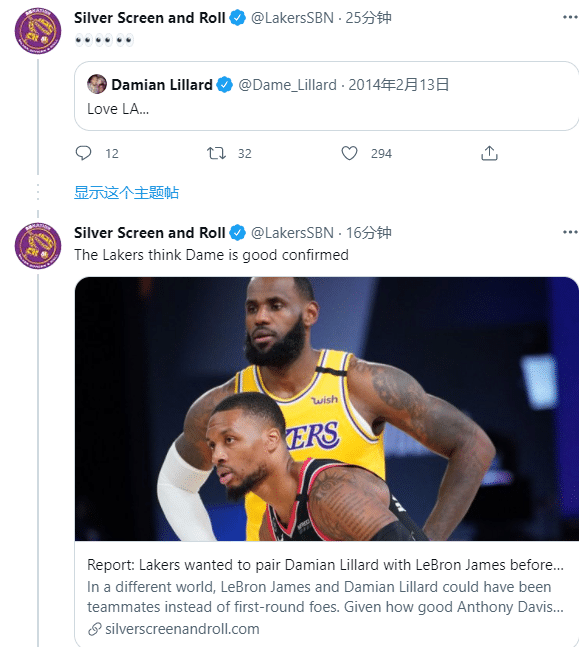 虽然湖人队并没有被视为潜在的下家,但是美国媒体SILVER在社交媒体上晒出了利拉德四年前示爱湖人队的动态。