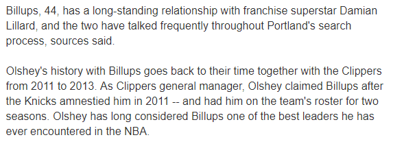 一是,比卢普斯与利拉德长久以来保持着紧密的关系,并且在开拓者选帅过程中;两人一直保持着沟通。