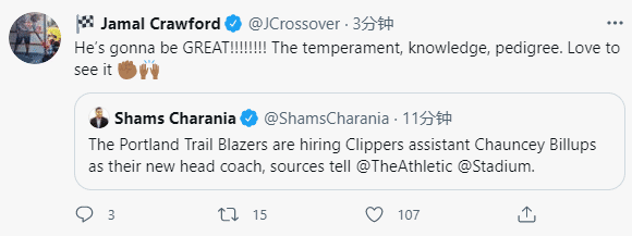 贾马尔-克劳福德发推写道:他会很棒的,气质、血统和知识,我很喜欢看到这件事发生。
