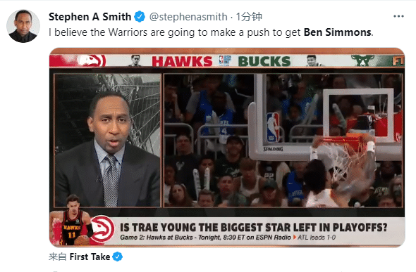 来源:JRS低调看直播06-26 09:54JRS低调看直播讯 北京时间6月26日,名嘴“美国杨毅”A-史密斯的言论引热议,史密斯直言西蒙斯最终可能加盟勇士,而且透露勇士已经有人打电话询价,更是发推直言:我相信勇士正在积极推动关于西蒙斯的交易。