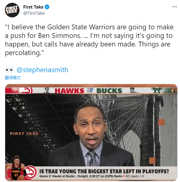 史密斯还表示:我不是说它会立即发生,但我相信勇士会努力争取西蒙斯,已经有人打过电话了,事情正在慢慢演变,如果最终这件事发生,我一点也不会感到惊讶。