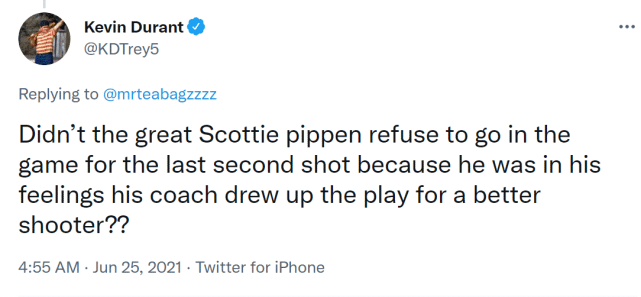 杜兰特直戳皮蓬职业生涯的两大槽点。第一件事,皮蓬在1994年5月13日对尼克斯的一场季后赛最后时刻拒绝登场,当时比分是102平,菲尔-杰克逊为库科奇制定了一个战术。执行最后一攻的不是自己,皮蓬感到不满,没有登场。库科奇命中制胜一球,帮助公牛104-102击败尼克斯。第二件事,皮蓬本可以在1997-98赛季开始前的休赛期接受手术,但他选择在赛季开始后再手术,并因此伤停了数月。