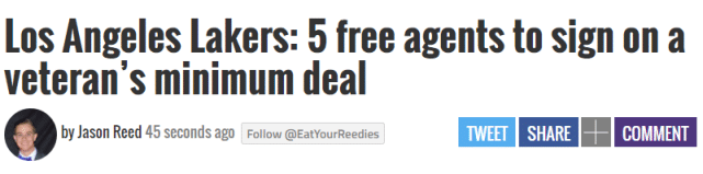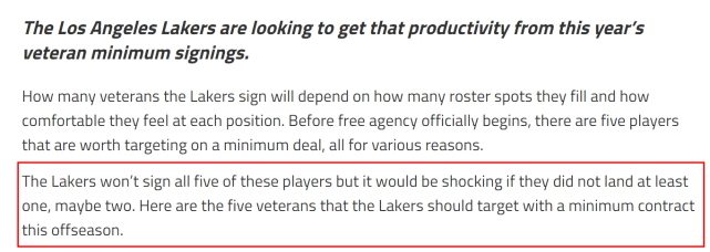 来源:JRS低调看直播06-24 14:58JRS低调看直播讯 季后赛首轮出局,湖人势必需要补强阵容。不过,受限于薪金空间,老将底薪合同将是佩林卡在休赛期的主要签约模式。北京时间6月24日,洛城媒体Lakeshowlife列出了五大底薪签约的目标,并指出湖人不会签下所有这五位球员,但如果他们没有至少签下其中一两位,那将是令人惊讶的。