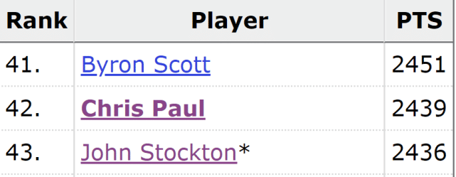 第二,保罗的季后赛生涯总得分已经达到2439分,排在历史第42位,只要他再拿13分,就可以超过排名第41位的拜伦-斯科特(2451分)。斯科特是保罗在黄蜂打球时的主教练。对于保罗来说,单场拿到13分并不难。横扫掘金的这4场季后赛,保罗场均能得到25.5分。