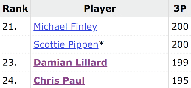 第四,保罗的季后赛生涯累计命中195个三分,在NBA历史上排名第24位。位居第23位的是利拉德(199个),排名第22位的是芬利和皮蓬(200个)。如果保罗外线手感够好,他有望追平甚至超过这些球星。这个赛季的常规赛,保罗有6场至少命中4个三分球。