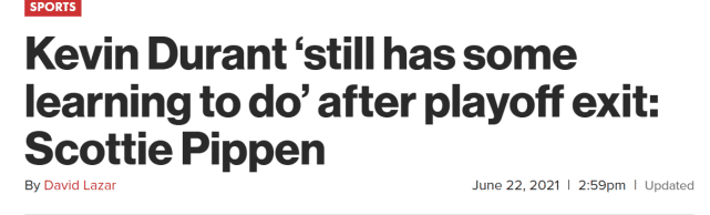 皮蓬曾经和乔丹并肩作战,并在上世纪90年代统治联盟。他认为杜兰特依然有上升的空间,可以变得更加强大。本赛季常规赛,杜兰特场均26.9分7.1篮板5.6助攻,季后赛,杜兰特场均34.3分9.3篮板4.4助攻。