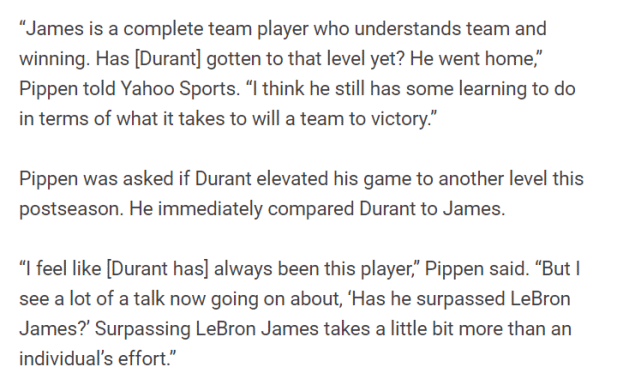 皮蓬对比詹杜:詹姆斯了解团队和胜利,杜兰特在这一点上仍需学习