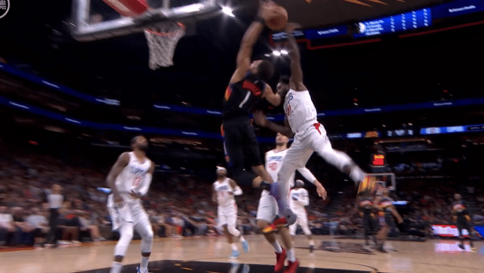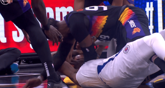 来源:JRS低调看直播06-23 10:20JRS低调看直播讯 北京时间6月23日,太阳和快船西决第二场,首节开场没多久,场上就发生激烈的身体接触,太阳悍将克劳德倒地和乔治拼抢球权,小莫里斯为队友抱不平,推了一把克劳德,最终两人都吃到技术犯规。