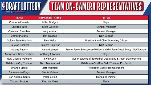 来源:JRS低调看直播06-22 11:32JRS低调看直播讯 北京时间6月22日,NBA官方公布了14支NBA球队的乐透抽签代表名单,而明天,NBA将进行乐透抽签仪式。具体的代表名单如下——