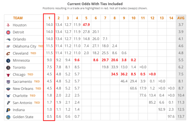 火箭的首轮签是前四保护,他们只可能抽到前五的签,如果火箭抽到5号签,这个签将属于雷霆。森林狼有27.6%的可能抽到前三顺位,但如果他们抽不到,勇士将获得他们的这支签。