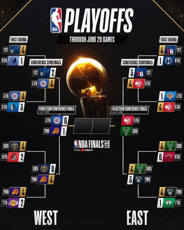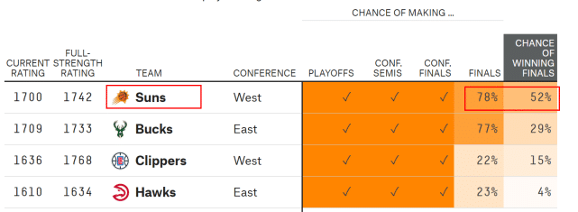 来源:JRS低调看直播06-21 15:42JRS低调看直播讯 北京时间6月21日,太阳120-114主场击败快船,拿下西决首胜。布克40分13篮板11助攻,拿下生涯第一次三双。老鹰103-96击败费城,和雄鹿会师东部决赛。赛后数据网站FiveThirtyEight第一时间更新了夺冠概率。太阳成为最被看好的球队。