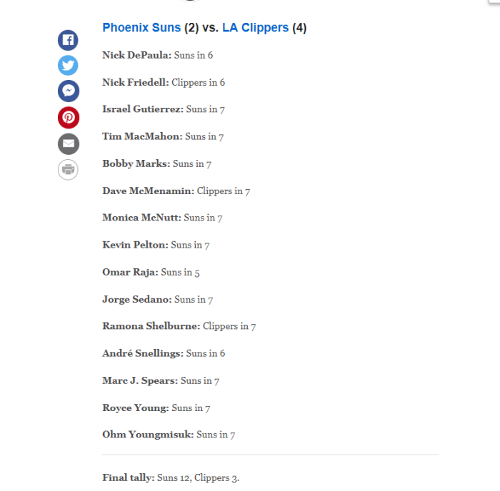 来源:JRS低调看直播06-21 10:36JRS低调看直播讯 北京时间6月21日,西部决赛太阳和快船的首战,就将在菲尼克斯进行。西决之前,ESPN15名专家对于这轮系列赛做了预测。结果显示12人看好太阳,3人看好快船。