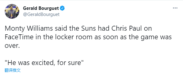 返回更衣室途中,布克第一时间掏出手机,和保罗开视频庆祝胜利,据太阳主教练蒙蒂-威廉姆斯透露,和布克视频对话时,保罗非常兴奋,保罗也伸出一根手指,并且渴望归队。