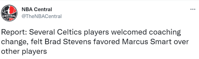 来源:JRS低调看直播06-20 10:43JRS低调看直播讯 北京时间6月20日,The Athletic名记Jared Weiss撰写长文,揭秘凯尔特人目前糟糕的球队氛围。报道称,凯尔特人队内的多位球员对于球队换帅表示欢迎。消息人士透露,他们抱怨史蒂文斯没让关键球员承担责任,还偏爱斯马特。