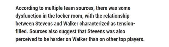史蒂文斯确实重用斯马特,而斯马特也在比赛中有不错的发挥。他在防守端的表现,是无可替代的。报道还表示,已经被交易的沃克,和史蒂文斯之间充满紧张的气氛,史蒂文斯对待沃克的态度比其他球星更严苛。他的防守失误,曾经遭到史蒂文斯的批评,两人多次在更衣室内争吵。