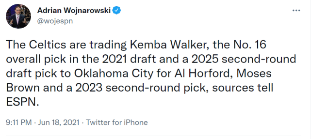 来源:JRS低调看直播06-19 12:02JRS低调看直播讯 北京时间6月18日,据ESPN名记沃纳罗斯基报道,凯尔特人和雷霆达成了一笔3换3的交易,凯尔特人送出肯巴-沃克、2021年的首轮16号签和2025年的次轮签,得到雷霆的艾尔-霍福德、摩西-布朗和2023年的次轮签。