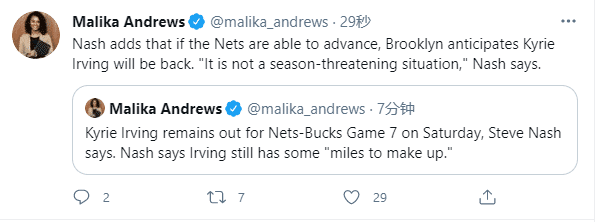 纳什表示欧文距离复出还有一段距离,他正在接受治疗和康复训练;欧文将会缺席G7,不过纳什表示若篮网能够打进东部决赛,欧文会在此轮系列赛中复出,他的伤病不会威胁整个赛季。