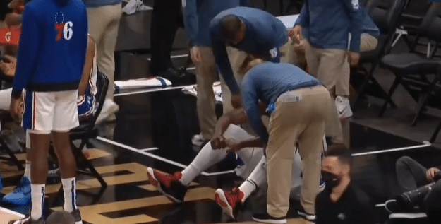 第三节4分多钟,特雷杨持球组织进攻,顺势向空中一抛,科林斯心领神会,高高跃起直接隔扣恩比德,空接平筐隔扣,然后和特雷杨一起庆祝,不过科林斯另外一只手搂住了恩比德脖子,恩比德面部被打了一下,有些痛苦,甚至坐在地板上缓了一会;回放之后,裁判仍旧吹罚恩比德防守犯规,科林斯残暴隔扣引热议。