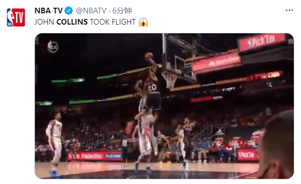 科林斯空接平筐隔扣恩比德瞬间冲上推特热搜,美媒纷纷转发这极其残暴的一幕,《露天看台》和NBA TV都发推写道科林斯在恩比德头上扣篮;科林斯残忍羞辱恩比德,这一球提前预定今日十佳扣篮之首,骑在大帝头上扣篮,老鹰悍将太疯狂了。