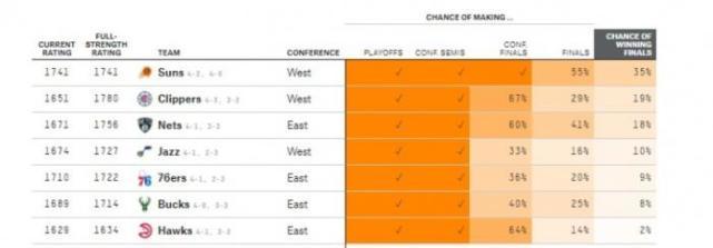 知名数据预测网站FiveThirtyEight赛后给出了目前还在进行季后赛的7支球队的一系列概率,其中篮网仍有60%概率赢下抢七。另外截止到现在太阳有35%可能夺冠是最大热门,篮网则有18%概率夺冠,随后是爵士的10%和76人的9%,雄鹿则是8%!