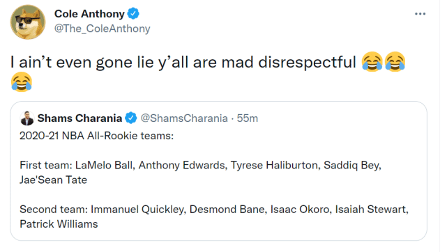 来源:JRS低调看直播06-18 10:55JRS低调看直播讯北京时间6月18日,NBA官方公布最佳新秀阵容。入选一阵的包括三球、萨迪克-贝、爱德华兹、哈利伯顿、泰特,入选二阵的包括贝恩、奥科罗、奎克利、斯图尔特和帕特里克-威廉姆斯。魔术21岁新秀科尔-安东尼认为自己成为了最佳新秀阵容的遗珠,并在社媒上公开吐槽。