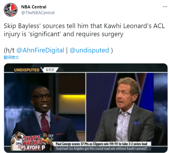 来源:JRS低调看直播06-18 10:43JRS低调看直播讯北京时间6月18日,快船巨星莱昂纳德的膝伤不容乐观,名嘴斯基普-贝勒斯在节目中爆料,小卡十字韧带伤势很严重,需要接受手术;名记直言小卡季后赛复出并不乐观。