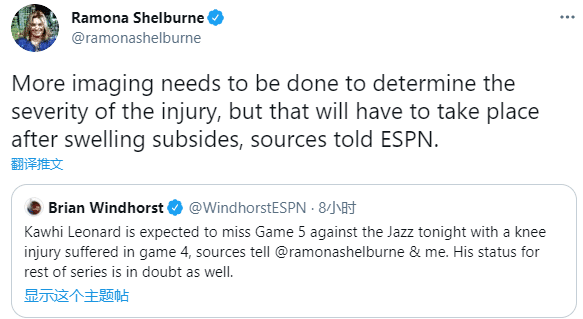 来源:JRS低调看直播06-17 10:26JRS低调看直播讯 北京时间6月17日,快船领袖莱昂纳德惨遭十字韧带的伤病,目前他的膝盖还没消肿,从而无法接受进一步的检查来确定受伤的严重程度;季后赛关键时期,小卡遭遇重伤,暂时还没有具体回归时间表,名嘴直呼快船完了。