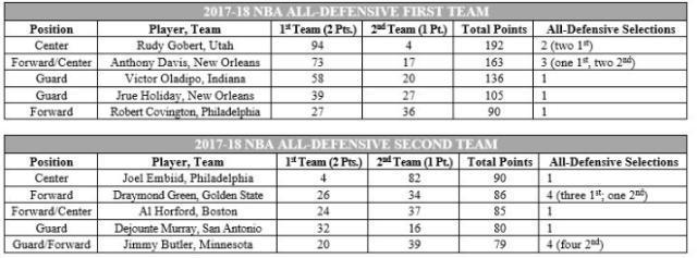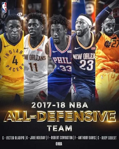 来源:JRS低调看直播06-16 20:56 JRS低调看直播讯北京时间2018年5月24日,NBA官方公布了2017-2018赛季NBA常规赛最佳防守阵容一、二队名单,爵士中锋戈贝尔得到了94张最佳防守第一阵的选票,无可置疑的入选最佳防守一阵,另外入选最佳一阵的还有安东尼-戴维斯(新奥尔良鹈鹕队)、考文顿(费城76人队)、奥拉迪波(印第安纳步行者队)、霍勒迪(新奥尔良鹈鹕队)。