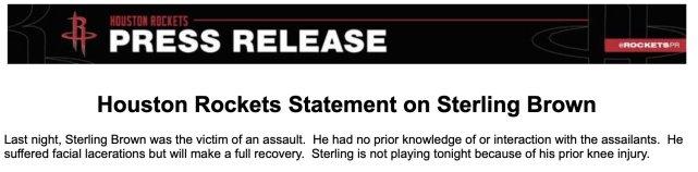 来源:JRS低调看直播04-20 16:23JRS低调看直播讯 北京时间4月20日,火箭官方公布,当地时间周日晚上,后卫斯特林-布朗在迈阿密突然遇袭。他并不认识袭击者,也没有和袭击者有过任何交流。他的面部受伤,此前,他遭遇膝盖伤病,原本就在养伤,现在旧伤未愈,又添新伤。火箭记者费根表示,布朗面部有多处划伤。