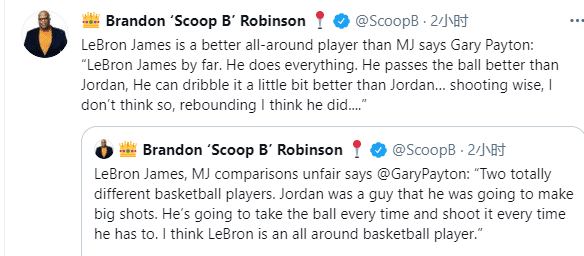 对比詹姆斯和乔丹,加里-佩顿表示:詹姆斯和乔丹是两个完全不同类型的球员,乔丹每次都要拿球并且投篮,詹姆斯什么都能做,他的传球、运球和篮板都比乔丹好一些,到目前为止,詹姆斯是一位比乔丹更加全能的球员。