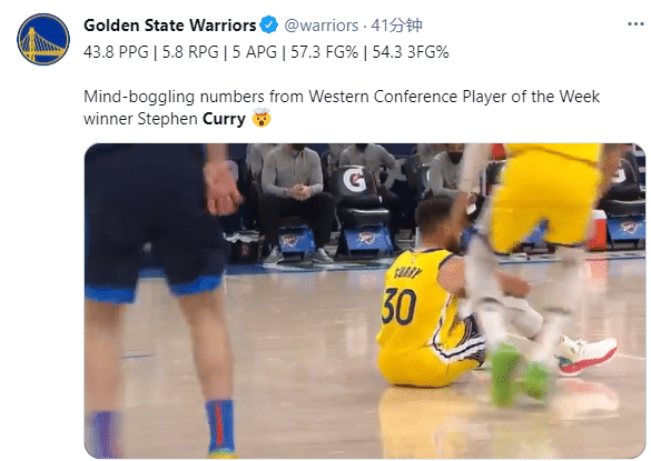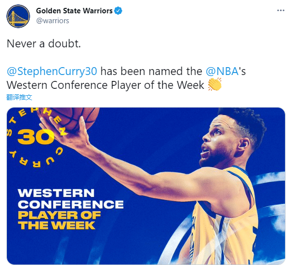 勇士官方连续更新动态,恭喜库里再次当选西部周最佳球员,官推写道:毫无悬念以及多么令人惊叹的数据。