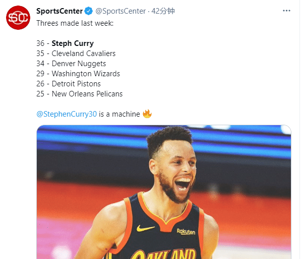 库里当选西部周最佳,美媒也直言毫不惊讶!美媒Sports Center列出更疯狂的数据,库里上周总共投进36记三分,比骑士(35记)、掘金(34记)、奇才(29记)、活塞(26记)和鹈鹕(25记)这五队上周投进的三分还多,库里一个人超过一支球队的单周三分命中数,而且多达5支球队不如他。