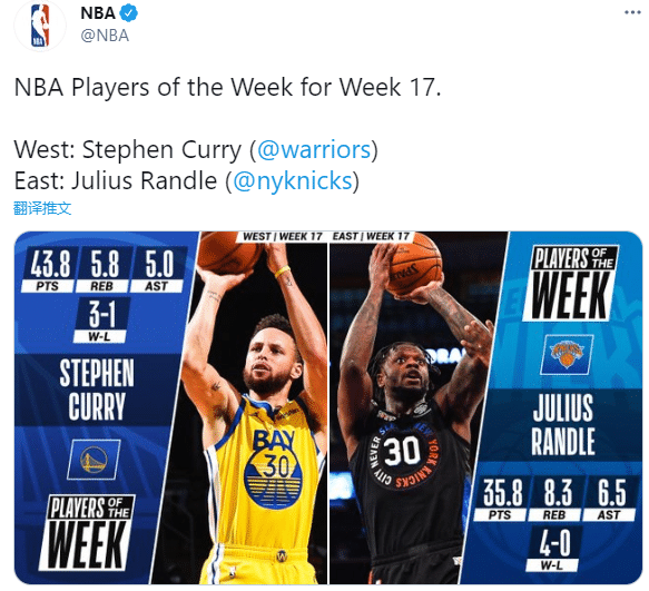 来源:JRS低调看直播04-20 16:17JRS低调看直播讯 北京时间4月20日,NBA联盟官宣本赛季第17周东西部周最佳球员,尼克斯球星兰德尔首夺东部最佳,上周场均35.8分83篮板6.5助攻,带队4胜0负,已成纽约新王;勇士球星库里再次当选,场均狂砍43.8分太疯狂,当选西部周最佳真乃实至名归。