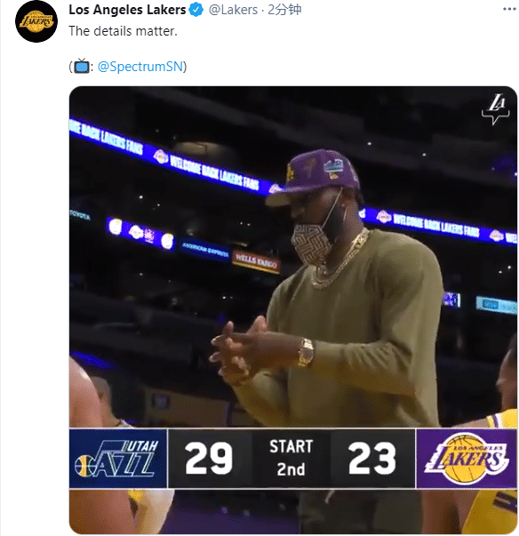 来源:JRS低调看直播04-20 16:07JRS低调看直播讯 湖人和爵士比赛中,詹姆斯因伤继续缺席比赛,继续坐在场边为队友加油打气,期间詹姆斯突然变身詹指导,穿金戴钻十分抢镜,站在湖人替补席指导队友,湖人官方晒出这一幕,发推写道:细节很重要;球迷调侃不好好管理饮水机,居然兼职教练了。