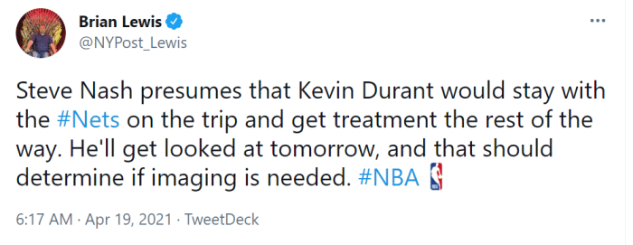 篮网在这场比赛中还失去了杜兰特,开场4分钟,杜兰特因左大腿挫伤离场。比赛最后阶段,他穿着便服来到场边继续观战。赛后纳什表示杜兰特感觉很痛,他会在明天接受评估,看看是否需要接受核磁共振检查。杜兰特会跟随篮网继续客场之旅,以方便接受治疗。