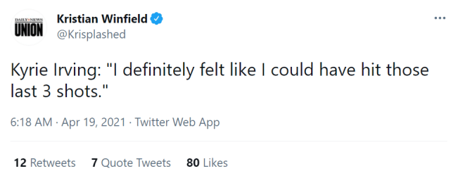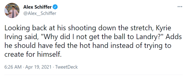 赛后,欧文在接受采访时表示:“我肯定是觉得自己能投中最后那三个球。”不过,欧文也承认自己后悔了。他说:“我怎么没把球给兰德里(沙梅特)呢?”他认为相比自己创造进攻机会,把球传给沙梅特才是最佳的方案。