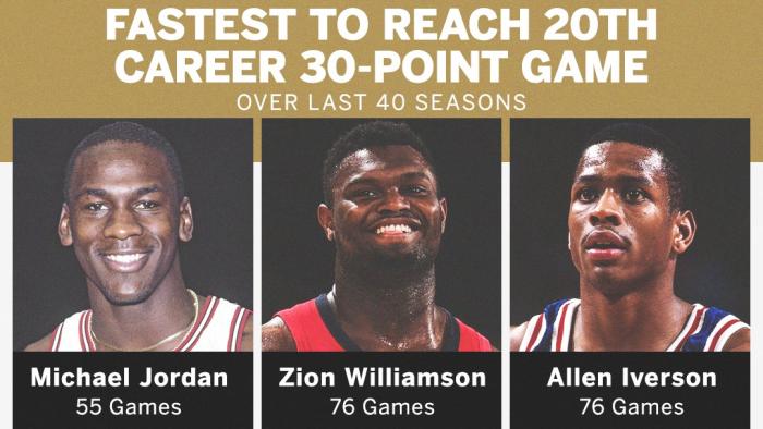 20岁锡安继续统治禁区,外线手感糟糕,但一招碾压式突破太无解,本赛季第17次单场得分30+,这也是锡安生涯第20场30+;锡安仅用76场比赛便拿到20次30+,成为NBA历史近40年达成如此神迹的第三人,追平艾弗森(76场)仅次于乔丹,乔丹生涯前55场就有20场30+。