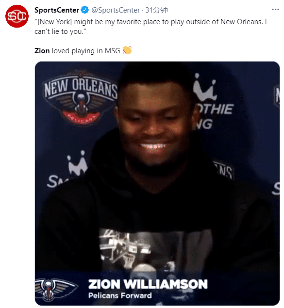 赛后,锡安言论引热议,谈到在纽约麦迪逊花园球馆打球时,锡安流露出发自内心的喜爱之情,几乎全程咧嘴大笑,笑着表态:我不能对你说谎,纽约是篮球圣地,除了新奥尔良鹈鹕之外,这里就是我最爱的球馆,我喜欢在这里打球的感觉。
