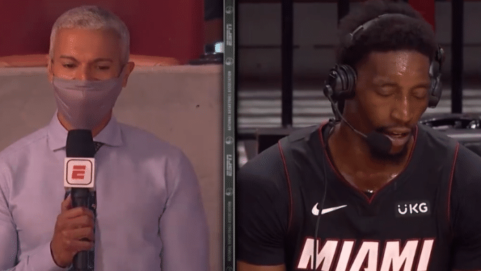 这场比赛的主角毫无疑问是绝杀成功的阿德巴约,他在比赛最后时刻迎着杰夫格林的防守打进,没有给篮网留下哪怕0.1秒的时候,是真正意义上的绝杀。比赛结束之后,阿德巴约结束连线采访,谈到绝杀之后的第一反应是什么,阿德巴约称:“是想像韦德一样站在技术台上疯狂庆祝。”