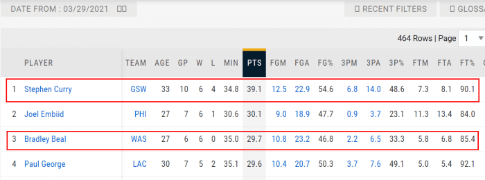 自从当地时间3月29日以来,库里10场比赛场均轰下39.1分,同期场均得分排名联盟第一,而且遥遥领先。同期排名第二的是恩比德,场均30.1分,比库里场均少拿9分。比尔位居第三,场均29.7分。