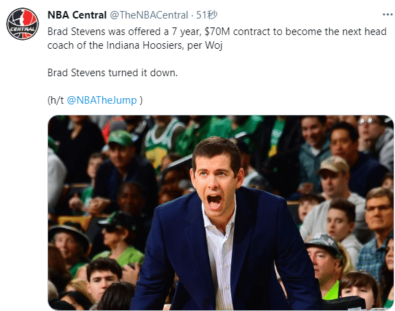 来源:JRS低调看直播04-18 15:30JRS低调看直播讯北京时间4月18日,据ESPN名记沃纳罗斯基报道,凯尔特人主帅布拉德-史蒂文斯拒绝了一份来自印第安纳大学7年7000万美元的主教练合同;少帅拒绝7年7000万美元大合同,年薪高达千万美元,目前史蒂文斯年薪不详,去年他和球队达成提前续约合同。