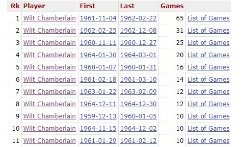 勇士队史连续30+榜单,库里以10场位居队史第九名,前八名全部是张伯伦创造的;